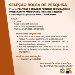 O OPSFaC divulga a seleção de estudante para 01 vaga de bolsa PIBIC (ciclo 2025-2026) para o projeto: POLÍTICAS E SERVIÇOS PÚBLICOS DE CUIDADO EM PAÍSES LATINO-AMERICANOS: inovações e desafios.